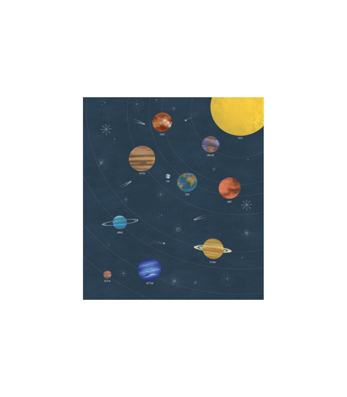 Le système solaire s’affiche sur les murs dans un panoramique aussi instructif que décoratif. On y retrouve le nom des planètes qui font tourner la tête du Soleil et on se rend compte que finalement la Terre est bien petite dans ce monde infini. Le tout sur fond de Voie Lactée et dans des coloris réalistes.