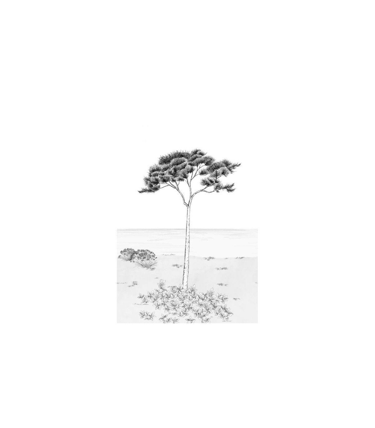 Un pin comme un phare près de la mer Mystérieusement dressé près d'une plage méditerranéenne, ce pin élégant diffuse son odeur résinée aux alentours. On aime sa stature élégante, soulignée par le travail de l'encre, qui offrira un surcroît de hauteur au mur qui l'accueillera.