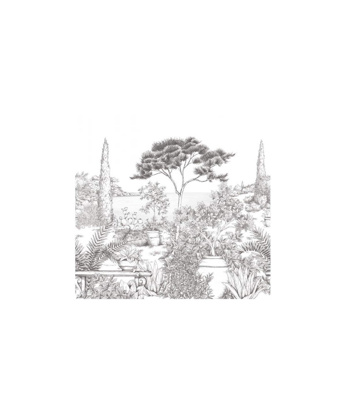 Imaginez-vous transporté au cœur d’un jardin méditerranéen... Ce panoramique est une douce composition à l’encre de Chine, délicatement rehaussée d’aquarelle, rendant hommage aux luxuriants parcs de la Côte d’Azur, entre plantes exotiques, poteries d’Anduze et terrasses baignant dans une lumière tamisée Séguret Décoration. Le noir fusain confère au décor une profondeur à la fois poétique et énigmatique.