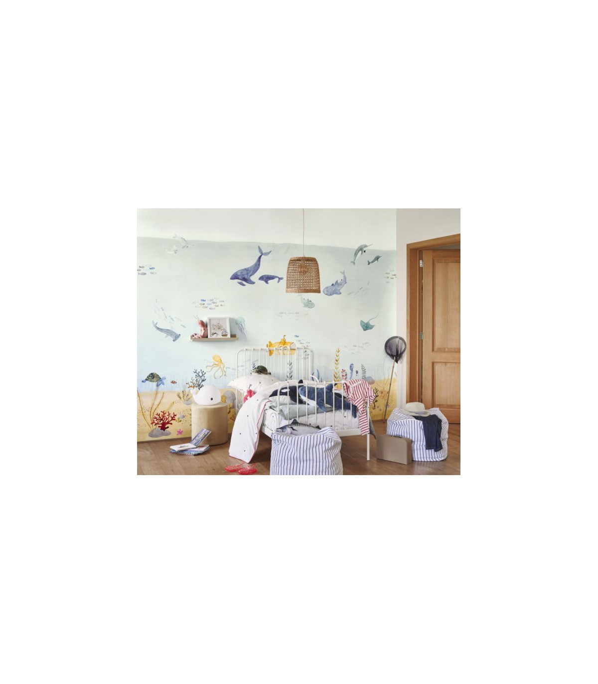 Le papier peint panoramique Exploration Under the Sea Bleu L, issu de la collection Once Upon a Time 2 de Casadeco, immerge les enfants dans un univers sous-marin fascinant et coloré. Sur un fond bleu profond, poissons, tortues, méduses et coraux se déploient dans un décor illustré à la main, créant une scène ludique et poétique qui stimule l’imagination et invite à explorer les merveilles de l’océan dans un cadre à la fois joyeux et immersif.