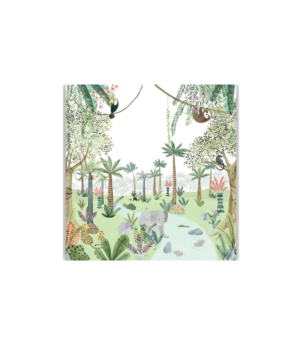 Le panoramique In the Heart of the Jungle Vert M, issu de la collection Once Upon a Time 2 de Casadeco, transporte les enfants au cœur d’une jungle luxuriante et pleine de vie. Sur un fond vert profond, singes, lions, éléphants, perroquets et plantes exotiques s’animent dans un décor illustré à la main, créant une scène immersive et ludique qui stimule l’imagination et invite à explorer la nature avec curiosité et émerveillement.