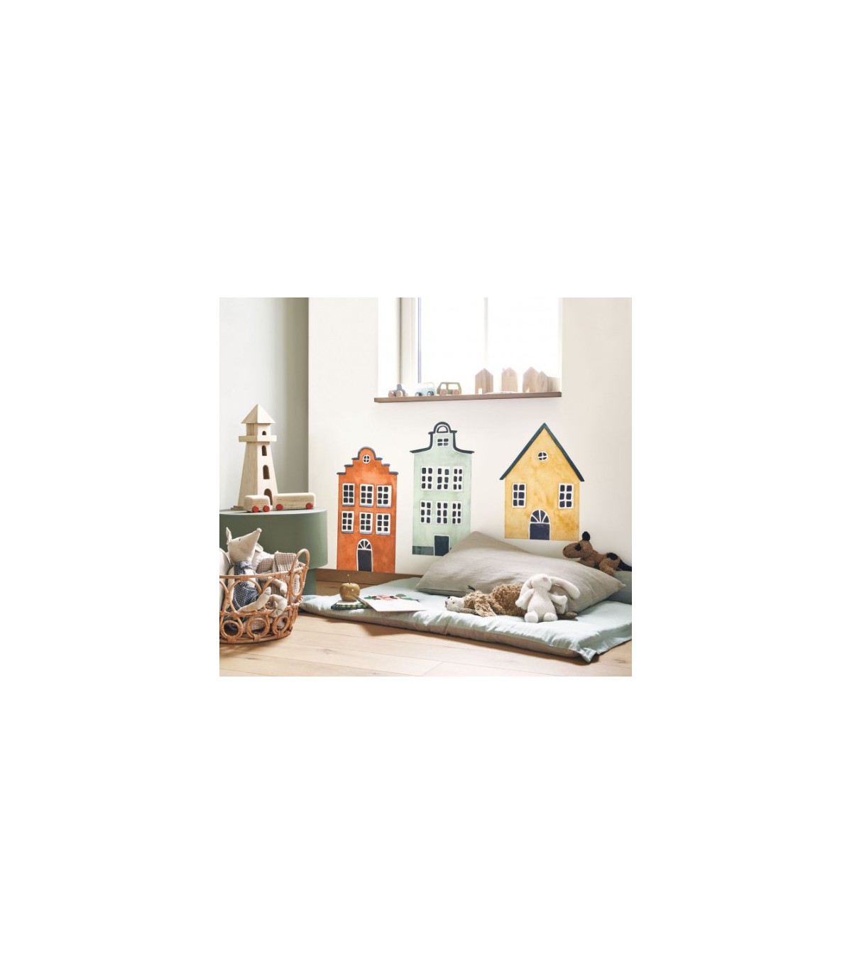 Le panoramique Little Houses Spray Up Multicolore, issu de la collection Once Upon a Time 2 de Casadeco, plonge les enfants dans un charmant village coloré et plein de vie. 3 Maisons XL Inspirés des villages flamands, ces 3 décors pré-encollés figurent des maisons à l’architecture typique. Leur belle hauteur et leur dessin aquarellé les rendent idéals pour (se) raconter de belles histoires. C’est le minimum requis pour admirer l’architecture des maisons du village de Souris-Land ! Le long des façades toutes différentes sur 2 mètres de long, on aperçoit des badauds en vélo ou des piétons en promenade.