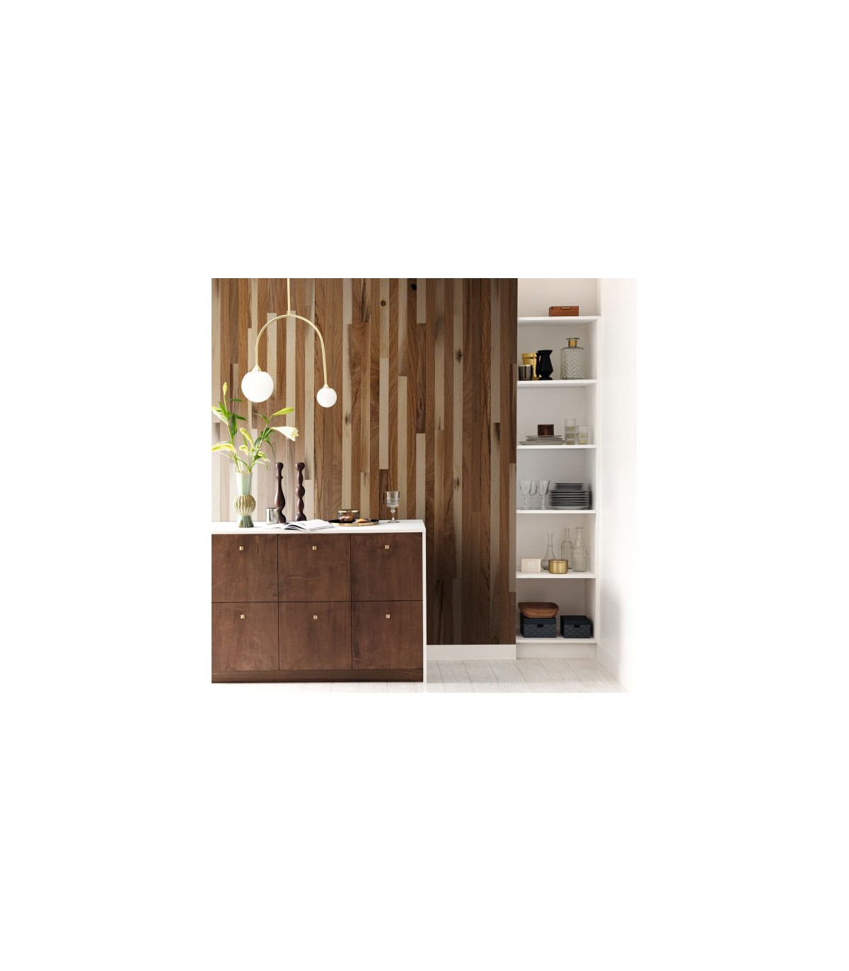 On revisite sur papier peint panoramique la matière noble et chaleureuse qu’est le bois. Illusion garantie pour la version brute inspirée des revêtements bois comme pour la version peinte effet moulure.