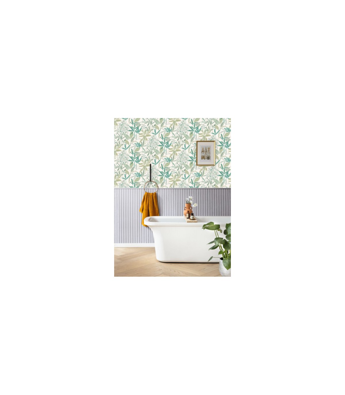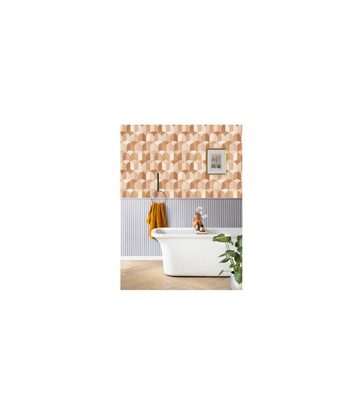 Grand retour du soubassement qui se décline ici en papier peint et dans deux motifs audacieux : un très linéaire graphique et un très artistique effet marbre. Tous ont été faits main dans nos ateliers.