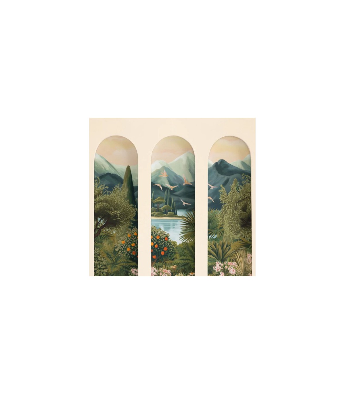 On met de la nature dans la déco avec deux panoramiques, un inspiré des toiles d’artistes ou un des trompe l’œil végétaux. On joue même l’effet verrière d’artiste ou arches de patio pour un bel effet de profondeur toujours en intérieur.