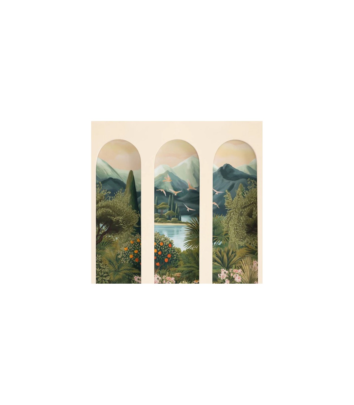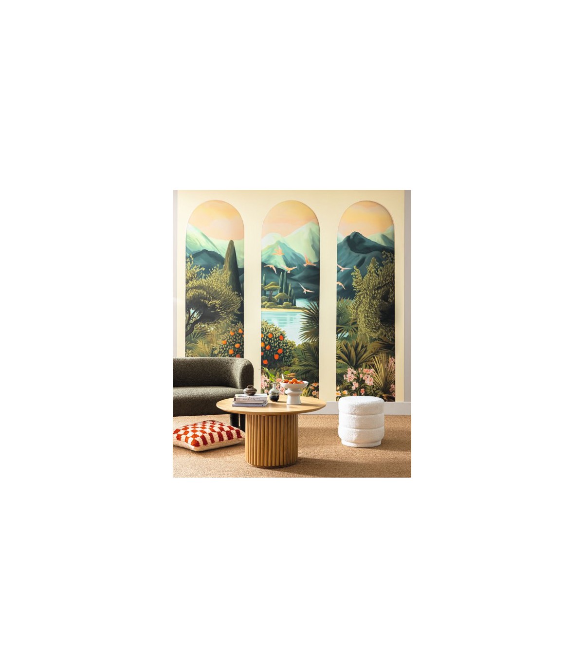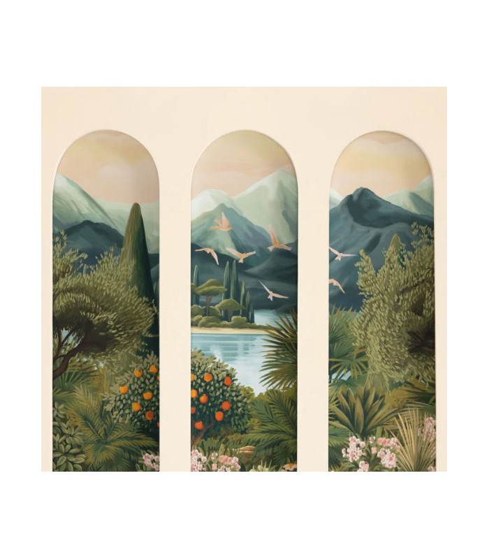 On met de la nature dans la déco avec deux panoramiques, un inspiré des toiles d’artistes ou un des trompe l’œil végétaux. On joue même l’effet verrière d’artiste ou arches de patio pour un bel effet de profondeur toujours en intérieur.