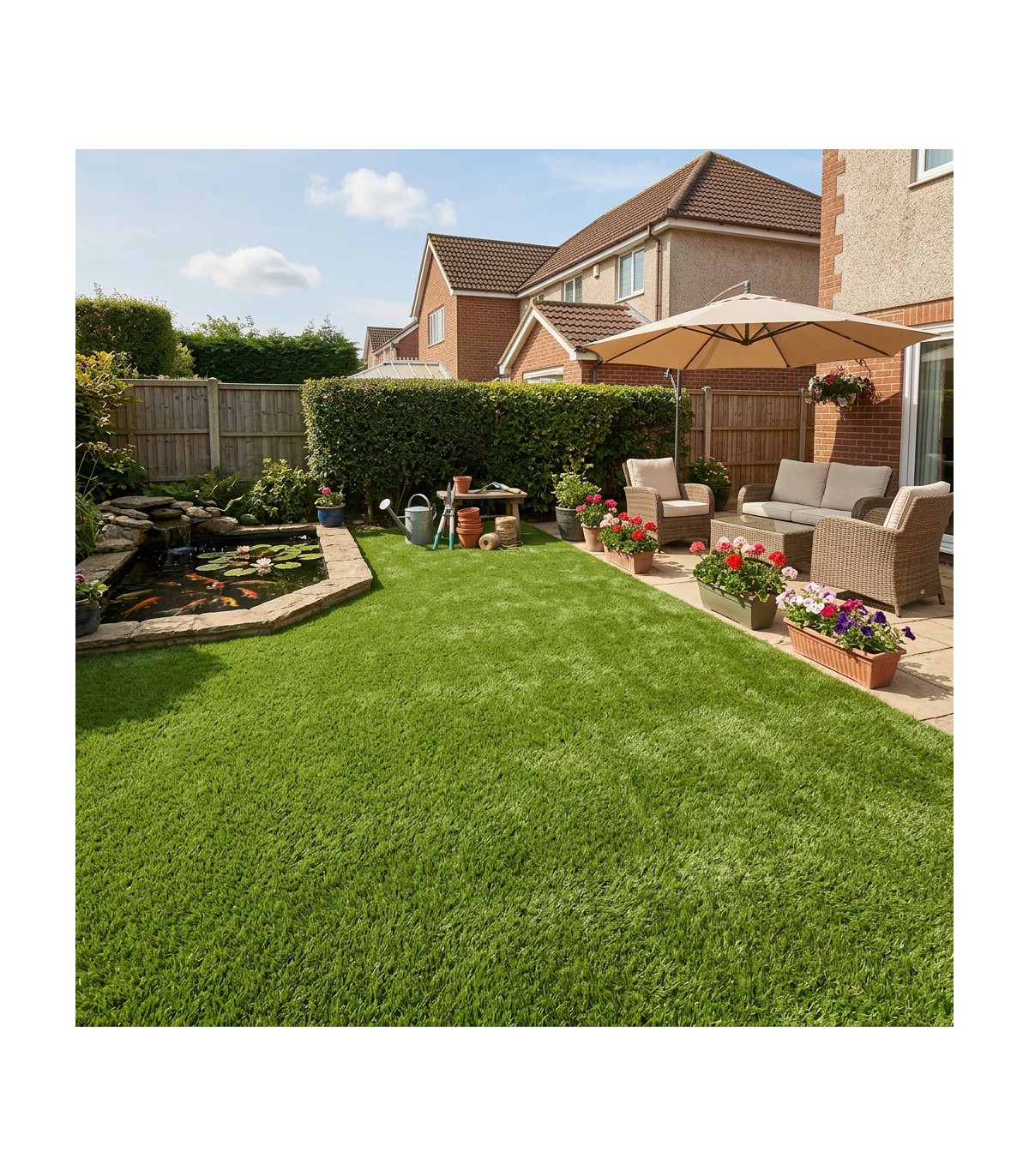 Wembley est parfait pour les grands jardins, les bords de piscine et les espaces publics. Sa résistance à l’usure et sa mémoire de forme des fibres permettent de garder un aspect soigné et dense malgré le passage fréquent.