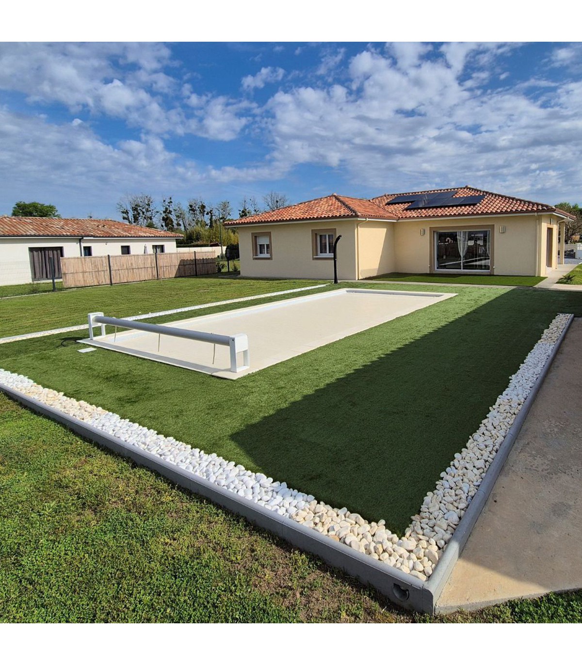 L’installation est simple et rapide. Préparez le sol, posez un géotextile, déroulez le gazon, fixez les bandes de jonction et votre pelouse est prête à l’usage. Aucun entretien particulier requis.