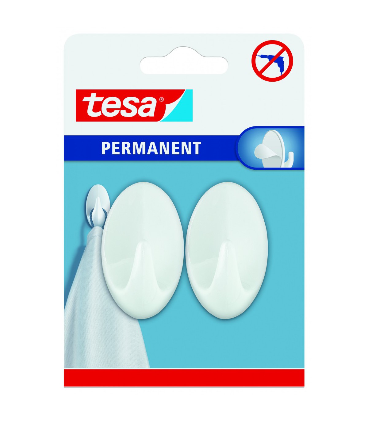 tesa® Crochets Permanents Ovales Blancs, dotés d'une face arrière adhésive efficace pour leur fixation permanente sur le carrelage, le verre, le bois et d'autres surfaces lisses.