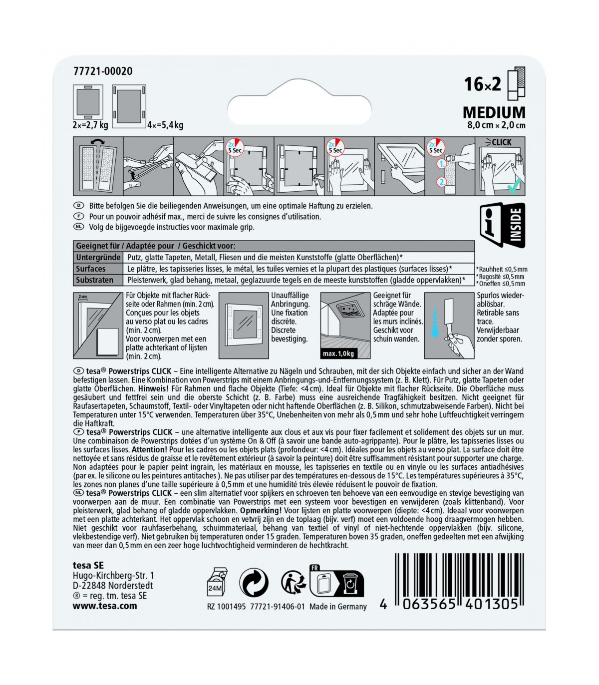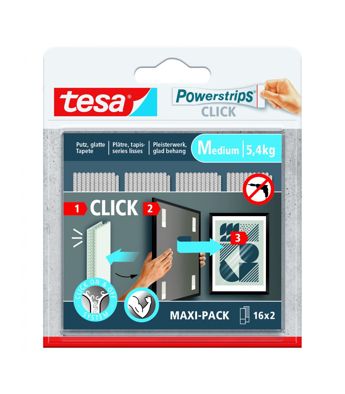 Les languettes adhésives tesa Powerstrips CLICK 16x2 M permettent de décorer facilement vos murs et de renouveler vos cadres et photos sans effort, tout en protégeant vos surfaces.