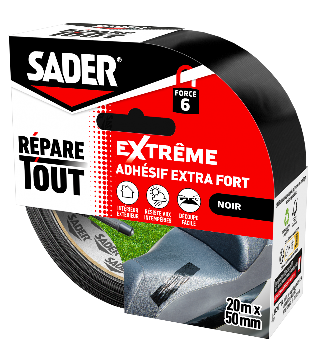Le ruban adhésif Répare Tout Extrême Noir est conçu pour toutes les réparations exigeantes sur plastique, verre, bois, métal, tissu, céramique, carrelage et carton (hors PE, PP et Téflon). Il offre haute adhérence, flexibilité et résistance aux chocs et vibrations, assurant une réparation durable à l’intérieur comme à l’extérieur.