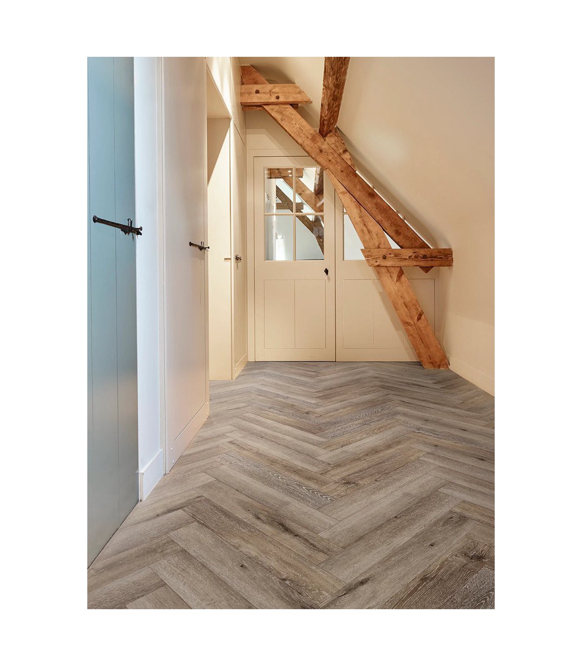 La pose parquet PVC clipsable en chevrons est facilitée par le système d’emboîtement Coretec. Les lames PVC clipsables s’installent sans colle sur un support plan, offrant un rendu structuré et harmonieux tout en garantissant une excellente tenue dans le temps.