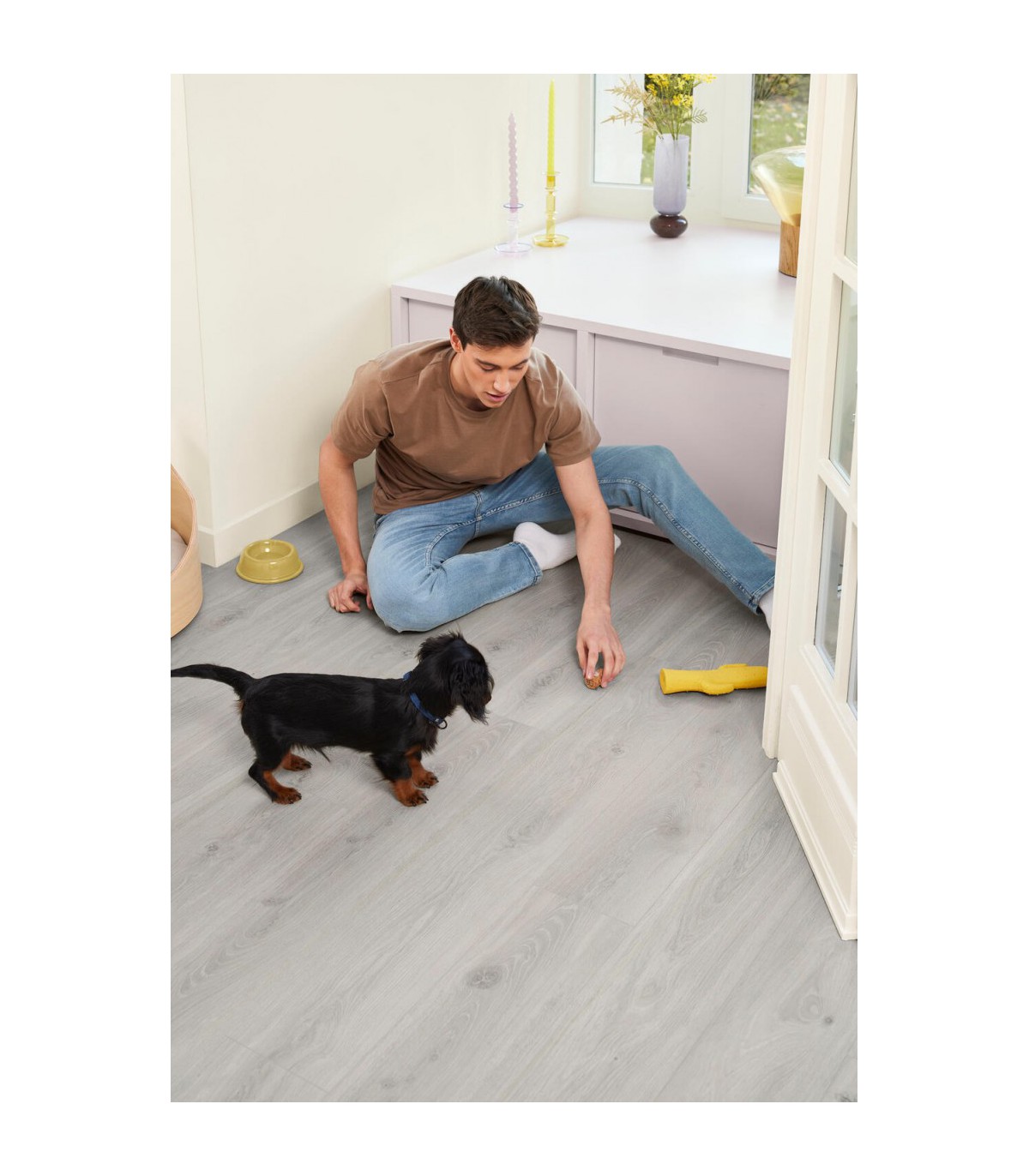 La teinte Bloom Silver Grey apporte un noir-gris profond qui sublime les intérieurs modernes et contemporains. Sa nuance raffinée capte subtilement la lumière et crée une atmosphère élégante et lumineuse, parfaite pour un parquet stratifié pas cher avec rendu haut de gamme.