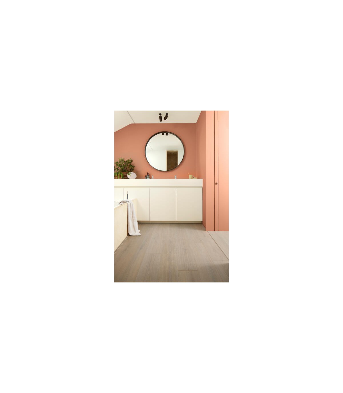 La teinte Select Light Brown apporte chaleur et authenticité grâce à ses nuances bois claires et naturelles. Elle illumine les espaces et convient parfaitement à un parquet pour salle de bain ou tout intérieur contemporain. Les lames longues avec chanfreins renforcent l'effet bois massif et créent un sol homogène et élégant.