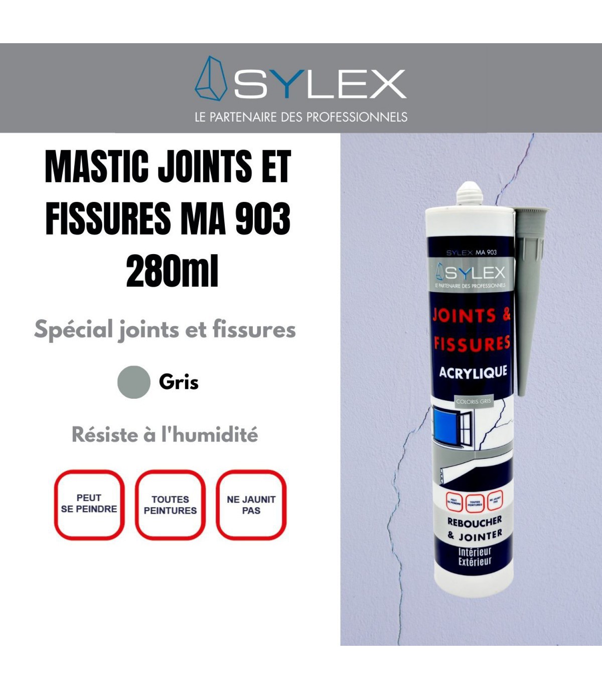 Le mastic acrylique SYLEX MA est un produit professionnel conçu pour la réalisation de joints à faible mouvement et le rebouchage de fissures sur supports poreux. Grâce à sa formulation plasto-élastique, il offre une excellente souplesse tout en garantissant une finition propre et durable.