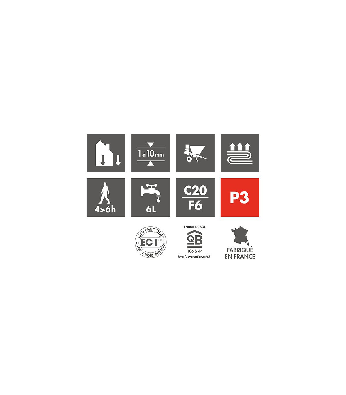 - Excellente adhérence sur supports classiques, dalles bétons, chapes ciment.