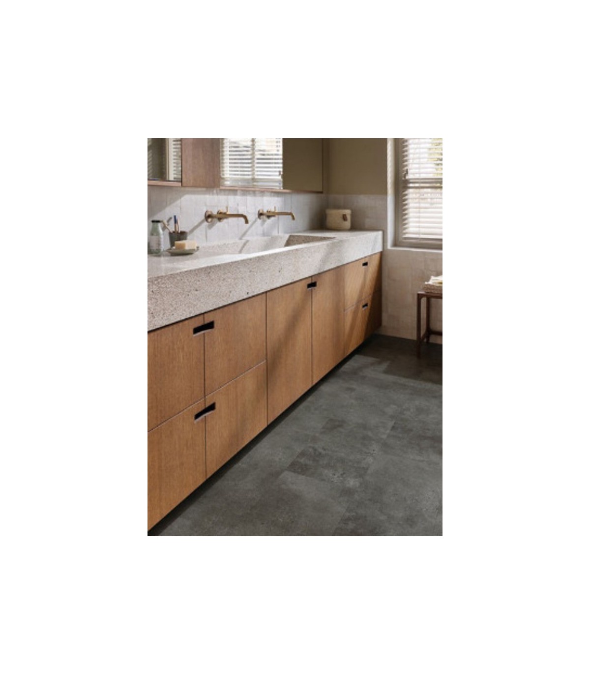 Ce parquet PVC combine l’aspect minéral et raffiné du béton avec la résistance à l’eau et aux chocs. Moins d’entretien et meilleure durabilité par rapport aux carreaux classiques.