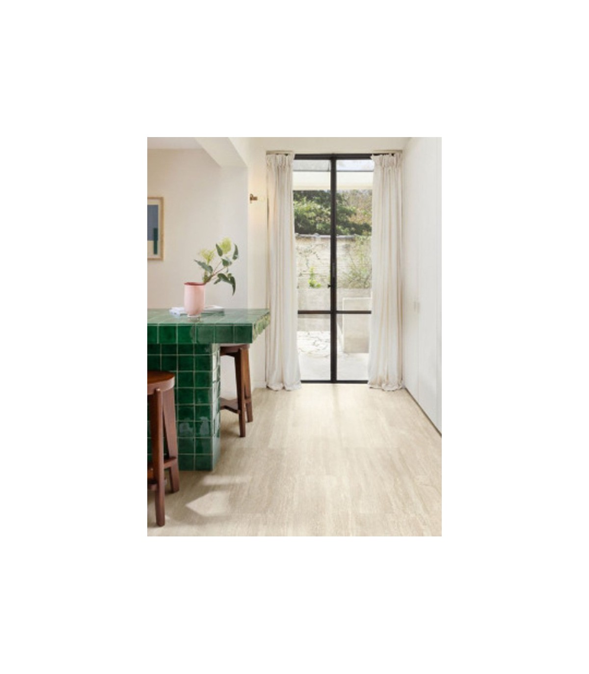 Le décor Montecelio reproduit un travertin à finition mate avec des veines remplies de ciment, mêlant des tons osseux et gris. Son rendu subtil et élégant crée une base lumineuse et accueillante, adaptée à tous les styles d’intérieur. Ces lames PVC assurent également un revêtement de sol étanche et résistant.