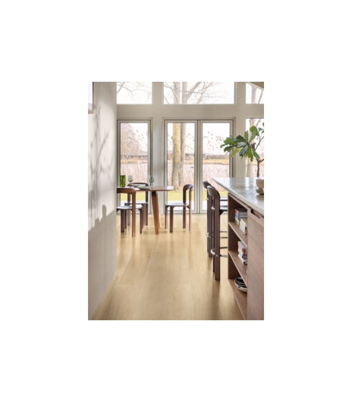 Le décor Haarlemmer Oak propose un chêne clair, avec un grain droit et un motif rifté délicat. Sa texture douce et naturelle confère à votre intérieur une atmosphère sereine et élégante. Ce parquet PVC est également un revêtement de sol étanche, pratique pour toutes les pièces de vie.