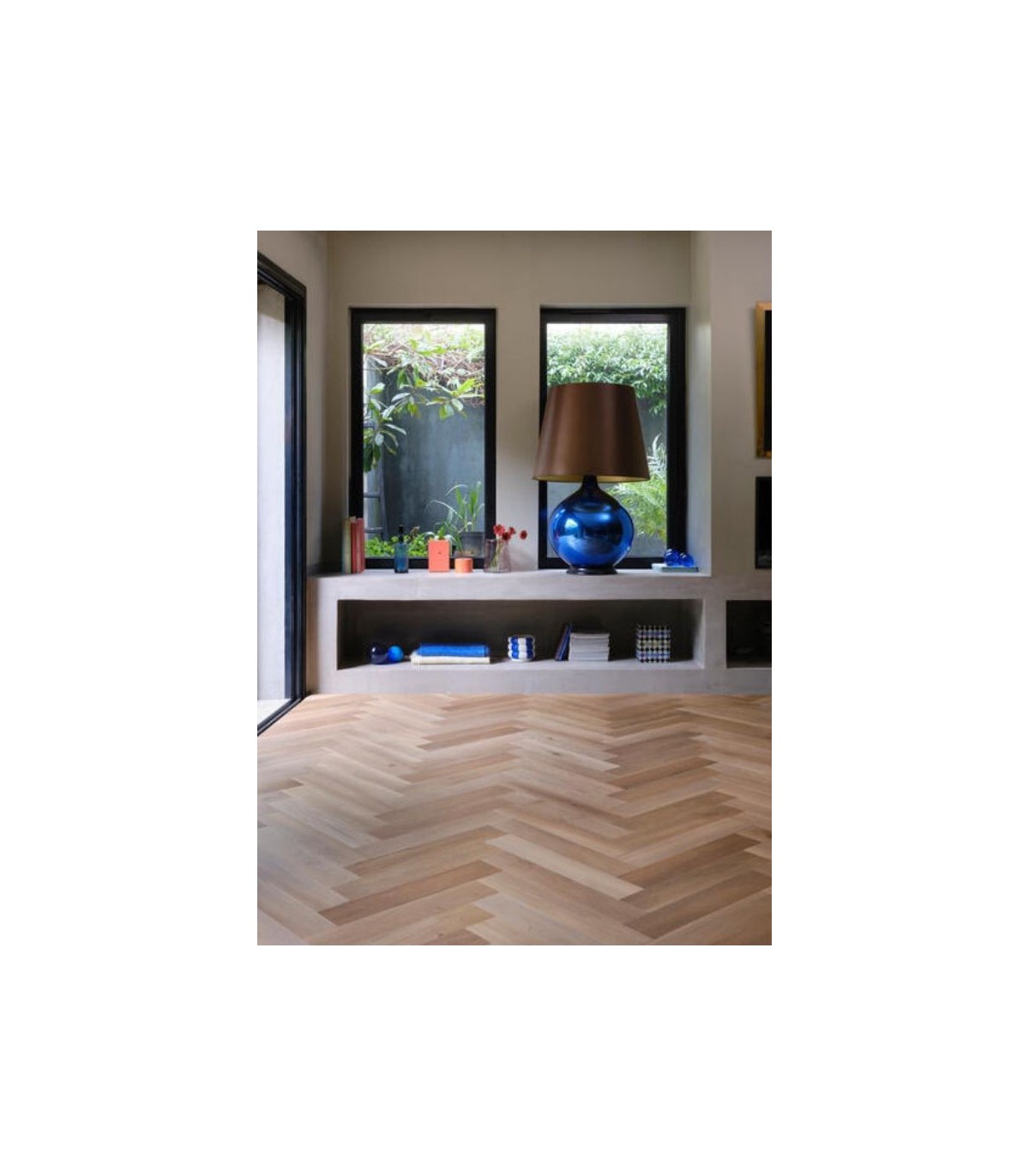 La collection propose différents styles et formats afin de répondre à toutes les envies d’aménagement. On retrouve des lames longues et élégantes mais également des formats destinés aux poses traditionnelles en chevron ou en point de Hongrie, permettant de créer des sols au style classique et raffiné. Les finitions Aged ou Rustic accentuent encore davantage le caractère du bois avec des nuances naturelles et des irrégularités qui renforcent l’effet parquet ancien rénové.